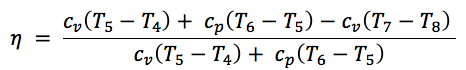 Thus, the thermodynamic efficiency of the IC engine used to power the AAFO can be calculated using Equation 3 and the temperatures found from the gas power cycle. It is interesting to note that because the dual-combustion engine cycle is a combination of the Otto and Diesel cycles, the efficiency of the dual-combustion cycle will always fall somewhere between the Otto and Diesel.