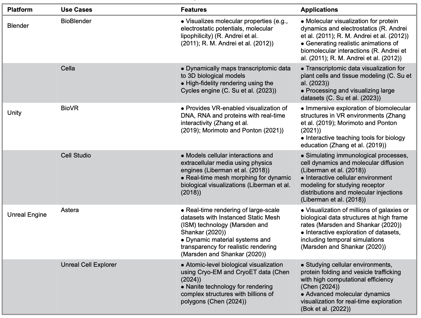 This paper focuses on three platforms applicable to the visualization of biological data: Blender, Unity and Unreal Engine. Table 1 summarizes key information about these platforms, including their use cases, features and potential applications.